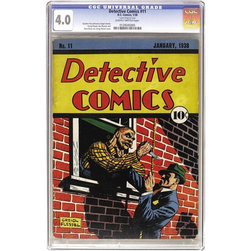 <B>Detective Comics #11 (DC, 1938) CGC VG 4.0 Slightly brittle pages.</B></I> Creig Flessel endowed his figures with a certain panache - never more so than in his rendition of a dapper Speed Saunders on this wonderful cover, which stands as perhaps the best of <B>Detective</B></I>'s pre-Batman run. Flessel also drew two interior stories; other artists include Joe Shuster and Sven Elven. According to Ernie Gerber, who assigned the book his "7" rating, this issue is harder to find than those immediately preceding or following it. CGC notes, "1 piece of tape on cover." Overstreet 2006 VG 4.0 value = $1,050. CGC census 5/06: 2 in 4.0, 3 higher. <BR><BR><B>Important notice:</B> Heritage usually auctions material at the rate of 200-250 lots per hour. On some occasions eBay Live bid software or the Internet may not be able to keep up with the pace of the auction. We recommend placing a realistic absentee bid now as insurance to avoid disappointment. Occasionally the auctioneer may eliminate or reject an eBay Live bid, and the auctioneer may also reopen a lot after the close of the eBay live bidding (usually because we missed an audience bid), and may reject your bid even if it shows you as the winning bidder. By bidding via eBay Live, you agree that Heritage may award the lot to another bidder at its sole discretion under the circumstances described above or any other reasonable circumstances. Since eBay bids are not shown to us until we open the lot on the floor, we treat those bids just like floor bids. In most cases the floor responds before the eBay bid is presented to us, due to Internet lag time, so for consistency we have made it a policy that floor bids are always considered first over tie eBay live bids. Also please note that all Heritage lots purchased through eBay Live carry a 22.5% Buyer's Premium. Please make sure you read the Terms and Conditions before you bid. This lot is being auctioned in conjunction with a live floor auction by Heritage Auction Galleries. All final auction and invoice information will be supplied by Heritage Auction Galleries, and all other information should be considered preliminary. Lot:41001 <BR><BR><B>Winning Notification and Billing:</B> After the FINAL session in this auction is complete, Heritage will send e-mail and snail mail invoices. This process normally takes several days. All final auction and invoice information will be supplied by Heritage Auction Galleries, and all other information should be considered preliminary. <BR><BR>This auction will be conducted on a live auction floor and over the Internet through eBay Live. If you choose to place an absentee bid, please take a moment to <font color='#0000ff'><u><a href='http://pages.ebay.com/liveauctions/help/before/laabsentee.html'>learn how eBay Live absentee bidding works</a></u></font><font color='#000000'>