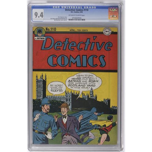 <B>Detective Comics #110 (DC, 1946) CGC NM 9.4 Off-white to white pages.</B></I> We were doubly pleased to spot this copy in Harold Curtis' collection -- not only is it tied for the highest grade CGC has assigned to date, it's got one of the more offbeat stories in the run, with Batman and Robin going to London along with English butler Alfred to face a villain named Moriarty! No doubt Win Mortimer's cover has our many U.K. bidders pondering an even more baffling mystery: why are the Houses of Parliament on a grass field, and who stole the Thames river? Mortimer handled interior art as well, and Curt Swan drew the Boy Commandos backup feature. Overstreet 2006 NM- 9.2 value = $985. CGC census 1/06: 2 in 9.4, none higher. <I>From the Collection of Harold Curtis.</B></I>