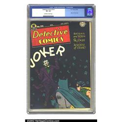 Detective Comics #114 (DC, 1946) CGC VF+ 8.5 Off-white to white pages. Dick Sprang gives us a cool Joker cover on this issue, and it's presented stylishly in this copy currently graded higher than all but one other issue #114, per CGC. The mis-cut cover is probably responsible for this book's grade, but it does have great eye-appeal. Overstreet 2002 VF 8.0 value = $611. Important notice: We expect to be auctioning lots at the rate of 200-250 per hour. Sometimes eBay Premier live bid software cannot keep up with that pace, so we strongly recommend that you place a realistic proxy bid now as insurance to avoid disappointment. Also please note that all Heritage/CAA lots purchased through eBay Premier carry a 20% Buyer's Premium. Please make sure you read the Terms and Conditions.