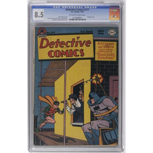 <B>Detective Comics #117 (DC, 1946) CGC VF+ 8.5 Off-white to white pages.</B></I> Batman and Robin take on some crooked steeplejacks (i.e. high-rise construction workers)! Bob Kane and Ray Burnley are credited with teaming up on both the cover and the issue's Batman story. Other features include the Boy Commandos (with Curt Swan art), Air Wave, and Slam Bradley. Overstreet 2006 VF 8.0 value = $456; VF/NM 9.0 value = $721. CGC census 1/06: 3 in 8.5, 4 higher. <I>From the Collection of Harold Curtis.</B></I>