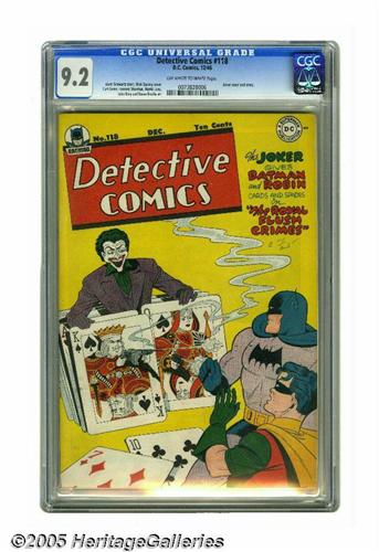 <B>Detective Comics #118 (DC, 1946) CGC NM- 9.2 Off-white to white pages.</B></I> "Royal flush" is the Joker's theme for his latest crime spree, and it's up to Batman and Robin to try to get him to fold his hand. Dick Sprang drew the Mocking Mountebank on the cover, with Howard Sherman supplying interior art for the Batman story. Other features include the Boy Commandos (with Curt Swan art), Slam Bradley, and Air Wave. Overstreet 2005 NM- 9.2 value = $1,300. CGC census 6/05: 1 in 9.2, 1 higher.