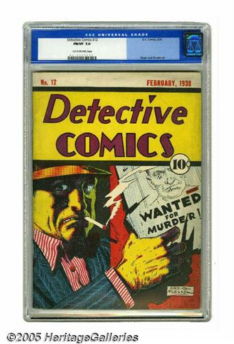 <B>Detective Comics #12 (DC, 1938) CGC FN/VF 7.0 Tan to off-white pages.</B></I> Creig Flessel's great run of covers is the highlight of the early issues of this series. Inside the book are sleuths like Slam Bradley and the Spy (both features written by Jerry Siegel and drawn by Joe Shuster), Speed Saunders (drawn by Flessel), and many more. Overstreet 2005 FN 6.0 value = $1,575; VF 8.0 value = $2,625. CGC census 6/05: 2 in 7.0, none higher.