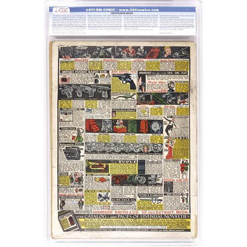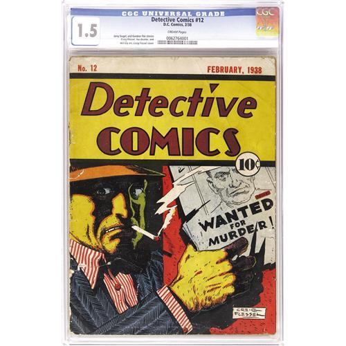 <B>Detective Comics #12 (DC, 1938) CGC FR/GD 1.5 Cream pages.</B></I> Creig Flessel's early <B>Detective</B></I> covers were never quite equaled in the crime genre - here's a typically moody study of an anonymous denizen of the underworld. Inside the issue are sleuths like Slam Bradley and "Bart Regan, Spy" (both features written by Jerry Siegel and drawn by Joe Shuster), plus Speed Saunders (drawn by Flessel), and many more. Overstreet 2006 GD 2.0 value = $525. CGC census 5/06: 1 in 1.5, 6 higher. <I>From the collection of Patrick Marchbanks.</B></I> <BR><BR><B>Important notice:</B> Heritage usually auctions material at the rate of 200-250 lots per hour. On some occasions eBay Live bid software or the Internet may not be able to keep up with the pace of the auction. We recommend placing a realistic absentee bid now as insurance to avoid disappointment. Occasionally the auctioneer may eliminate or reject an eBay Live bid, and the auctioneer may also reopen a lot after the close of the eBay live bidding (usually because we missed an audience bid), and may reject your bid even if it shows you as the winning bidder. By bidding via eBay Live, you agree that Heritage may award the lot to another bidder at its sole discretion under the circumstances described above or any other reasonable circumstances. Since eBay bids are not shown to us until we open the lot on the floor, we treat those bids just like floor bids. In most cases the floor responds before the eBay bid is presented to us, due to Internet lag time, so for consistency we have made it a policy that floor bids are always considered first over tie eBay live bids. Also please note that all Heritage lots purchased through eBay Live carry a 22.5% Buyer's Premium. Please make sure you read the Terms and Conditions before you bid. This lot is being auctioned in conjunction with a live floor auction by Heritage Auction Galleries. All final auction and invoice information will be supplied by Heritage Auction Galleries, and all other information should be considered preliminary. Lot:41001 <BR><BR><B>Winning Notification and Billing:</B> After the FINAL session in this auction is complete, Heritage will send e-mail and snail mail invoices. This process normally takes several days. All final auction and invoice information will be supplied by Heritage Auction Galleries, and all other information should be considered preliminary. <BR><BR>This auction will be conducted on a live auction floor and over the Internet through eBay Live. If you choose to place an absentee bid, please take a moment to <font color='#0000ff'><u><a href='http://pages.ebay.com/liveauctions/help/before/laabsentee.html'>learn how eBay Live absentee bidding works</a></u></font><font color='#000000'>