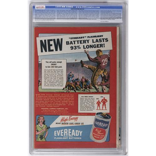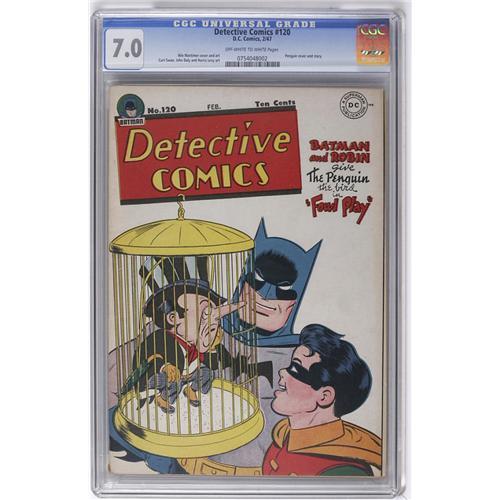 <B>Detective Comics #120 (DC, 1947) CGC FN/VF 7.0 Off-white pages.</B></I> "Rare above fine" is Overstreet's notation on this issue, owing to the white cover. Well, here's a copy that is indeed "above fine." In addition to the cover story with a Penguin appearance drawn by Win Mortimer, there's a Boy Commandos story with Curt Swan art as well as a story with that shamus whose first case was <B>Detective</B></I> #1, Slam Bradley. Overstreet 2006 FN 6.0 value = $510; VF 8.0 value = $1,063. CGC census 1/06: 2 in 7.0, 7 higher. <I>From the Collection of Harold Curtis.</B></I>