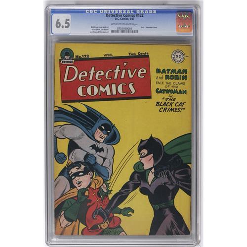 <B>Detective Comics #122 (DC, 1947) CGC FN+ 6.5 Off-white to white pages.</B></I> Catwoman's first appearance on a comic book cover was right here, in an issue published <I>seven years</B></I> after her first story! Equally stunning is the fact that it took her seven years to come up with a crime spree based on black cats, but that's what's on tap here, drawn by Bob Kane and Charles Paris. The Boy Commandos (drawn by Curt Swan), Air Wave, and Slam Bradley are among the issue's other features. Overstreet 2006 FN 6.0 value = $429; VF 8.0 value = $894. CGC census 1/06: 1 in 6.5, 12 higher. <I>From the Collection of Harold Curtis.</B></I>