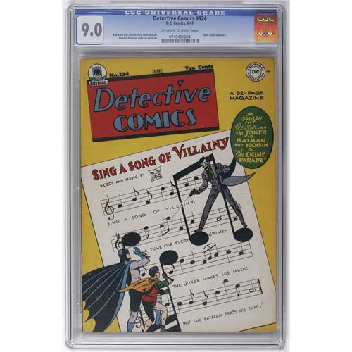 <B>Detective Comics #124 (DC, 1947) CGC VF/NM 9.0 Off-white to white pages.</B></I> The Mad Maestro of Mirth makes music! That is to say, hit songs are the theme of the latest crime wave he's cooked up. Bob Kane and George Roussos teamed up for the issue's cover art. The Boy Commandos and Air Wave appear in backup features. Overstreet 2006 VF/NM 9.0 value = $950; NM- 9.2 value = $1,300. CGC census 4/06: 1 in 9.0, 1 higher.