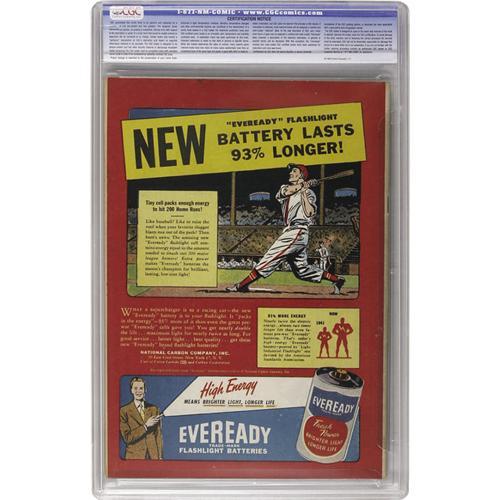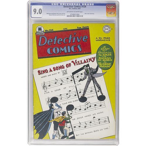 <B>Detective Comics #124 (DC, 1947) CGC VF/NM 9.0 Off-white to white pages.</B></I> The Mad Maestro of Mirth makes music! That is to say, hit songs are the theme of the latest crime wave he's cooked up. Bob Kane and George Roussos teamed up for the issue's cover art. The Boy Commandos and Air Wave appear in backup features. Overstreet 2006 VF/NM 9.0 value = $950; NM- 9.2 value = $1,300. CGC census 7/06: 3 in 9.0, 1 higher. <BR><BR><B>Important notice:</B> Heritage usually auctions material at the rate of 200-250 lots per hour. On some occasions eBay Live bid software or the Internet may not be able to keep up with the pace of the auction. We recommend placing a realistic absentee bid now as insurance to avoid disappointment. Occasionally the auctioneer may eliminate or reject an eBay Live bid, and the auctioneer may also reopen a lot after the close of the eBay live bidding (usually because we missed an audience bid), and may reject your bid even if it shows you as the winning bidder. By bidding via eBay Live, you agree that Heritage may award the lot to another bidder at its sole discretion under the circumstances described above or any other reasonable circumstances. Since eBay bids are not shown to us until we open the lot on the floor, we treat those bids just like floor bids. In most cases the floor responds before the eBay bid is presented to us, due to Internet lag time, so for consistency we have made it a policy that floor bids are always considered first over tie eBay live bids. Also please note that all Heritage lots purchased through eBay Live carry a 22.5% Buyer's Premium. Please make sure you read the Terms and Conditions before you bid. This lot is being auctioned in conjunction with a live floor auction by Heritage Auction Galleries. All final auction and invoice information will be supplied by Heritage Auction Galleries, and all other information should be considered preliminary. Lot:41001 <BR><BR><B>Winning Notification and Billing:</B> After the FINAL session in this auction is complete, Heritage will send e-mail and snail mail invoices. This process normally takes several days. All final auction and invoice information will be supplied by Heritage Auction Galleries, and all other information should be considered preliminary. <BR><BR>This auction will be conducted on a live auction floor and over the Internet through eBay Live. If you choose to place an absentee bid, please take a moment to <font color='#0000ff'><u><a href='http://pages.ebay.com/liveauctions/help/before/laabsentee.html'>learn how eBay Live absentee bidding works</a></u></font><font color='#000000'>