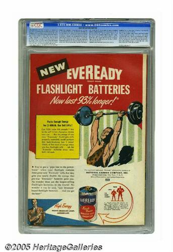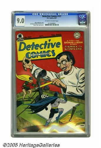 <B>Detective Comics #127 (DC, 1947) CGC VF/NM 9.0 Off-white to white pages.</B></I> Charles Paris had a crack at drawing Batman both on the cover and inside the issue, and in both cases he portrayed the Caped Crusader tangling with a mad scientist type named Dr. Agar. A Boy Commandos story with Curt Swan art is among the backup features. Overstreet 2005 VF/NM 9.0 value = $666; NM- 9.2 value = $900. CGC census 6/05: 2 in 9.0, 2 higher.