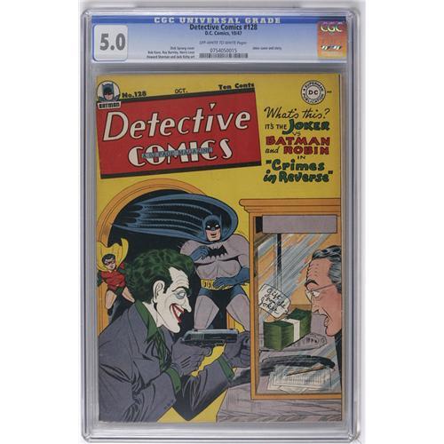 <B>Detective Comics #128 (DC, 1947) CGC VG/FN 5.0 Off-white to white pages.</B></I> Joker cover and story. Dick Sprang cover. Boy Commandos story with Jack Kirby art. Overstreet 2006 VG 4.0 value = $192; FN 6.0 value = $288. CGC census 1/06: 4 in 5.0, 17 higher. <I>From the Collection of Harold Curtis.</B></I>