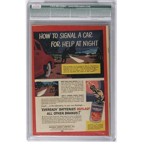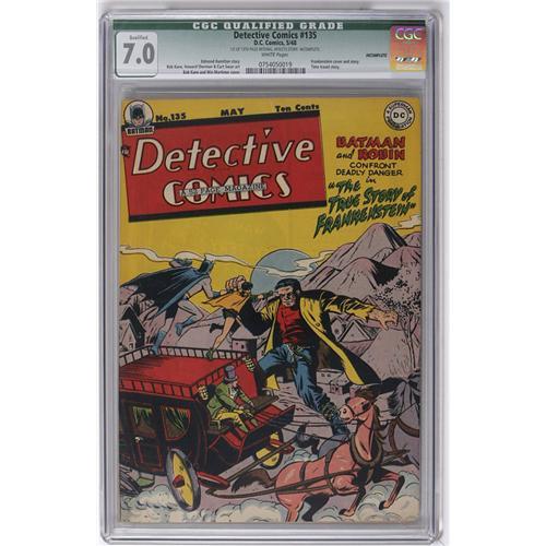<B>Detective Comics #135 (DC, 1948) CGC Qualified FN/VF 7.0 White pages.</B></I> Frankenstein cover and story (time travel story). CGC notes, "one-half of 13th page missing, affects story. Incomplete." Overstreet 2006 GD 2.0 value = $80; VG 4.0 value = $160; FN 6.0 value = $240; VF 8.0 value = $500. <I>From the Collection of Harold Curtis.</B></I>