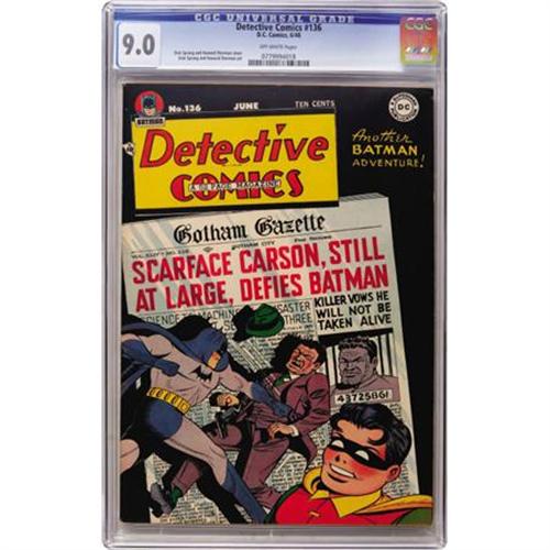 <B>Detective Comics #136 (DC, 1948) CGC VF/NM 9.0 Off-white pages.</B></I> The finest copy we've offered previously can't match this one -- it's the highest-graded in CGC's current census for issue #136. Dick Sprang and Howard Sherman teamed up for both the cover and interior artwork. Overstreet 2007 VF/NM 9.0 value = $635; NM- 9.2 value = $875. CGC census 6/07: 1 in 9.0, none higher.<BR><BR><b>Shipping:</b> Comics - Slabbed (certified) (<a target="_blank" href="http://www.heritageauctions.com/common/shipping.php">view shipping information</a>)