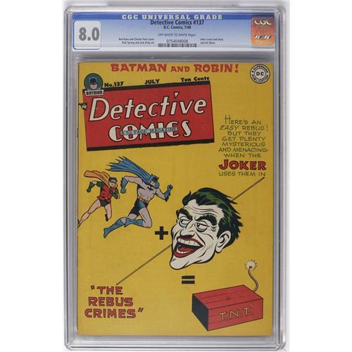 <B>Detective Comics #137 (DC, 1948) CGC VF 8.0 Off-white to white pages.</B></I> As of this writing, the only copy of this issue graded higher by CGC is just a half-grade higher at 8.5. Not only does this issue have a Joker story with Dick Sprang art, there's also a Boy Commandos tale credited to Jack Kirby. Bob Kane and Charles Paris teamed up on the cover. This issue is also notable for having the last new Air Wave story for thirty years! Overstreet 2006 VF 8.0 value = $506. CGC census 1/06: 1 in 8.0, 1 higher. <I>From the Collection of Harold Curtis.</B></I>