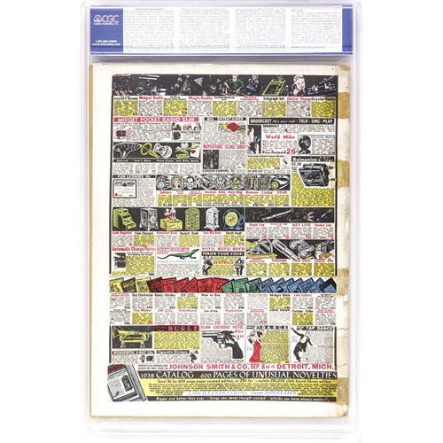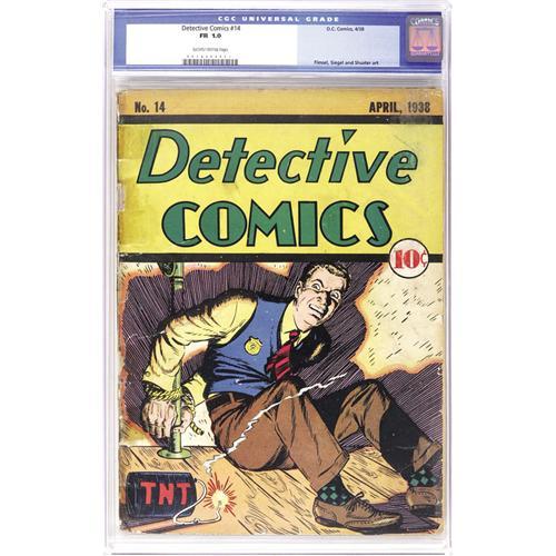 <B>Detective Comics #14 (DC, 1938) CGC FR 1.0 Slightly brittle pages.</B></I> This book is a Gerber "7," and just five unrestored copies have been certified by CGC to date. Cover artist Creig Flessel knew how to "zoom in" on a scene and use lighting to create mood, with this scene serving as a fine example! Flessel also drew the Speed Saunders feature inside the issue. Writer Jerry Siegel and artist Joe Shuster produced both the Spy and Slam Bradley stories for this issue, which came out a couple of months before <B>Action Comics</B></I> #1. Overstreet 2006 GD 2.0 value = $525. CGC census 5/06: 1 in 1.0, 4 higher. <I>From the collection of Patrick Marchbanks.</B></I> <BR><BR><B>Important notice:</B> Heritage usually auctions material at the rate of 200-250 lots per hour. On some occasions eBay Live bid software or the Internet may not be able to keep up with the pace of the auction. We recommend placing a realistic absentee bid now as insurance to avoid disappointment. Occasionally the auctioneer may eliminate or reject an eBay Live bid, and the auctioneer may also reopen a lot after the close of the eBay live bidding (usually because we missed an audience bid), and may reject your bid even if it shows you as the winning bidder. By bidding via eBay Live, you agree that Heritage may award the lot to another bidder at its sole discretion under the circumstances described above or any other reasonable circumstances. Since eBay bids are not shown to us until we open the lot on the floor, we treat those bids just like floor bids. In most cases the floor responds before the eBay bid is presented to us, due to Internet lag time, so for consistency we have made it a policy that floor bids are always considered first over tie eBay live bids. Also please note that all Heritage lots purchased through eBay Live carry a 22.5% Buyer's Premium. Please make sure you read the Terms and Conditions before you bid. This lot is being auctioned in conjunction with a live floor auction by Heritage Auction Galleries. All final auction and invoice information will be supplied by Heritage Auction Galleries, and all other information should be considered preliminary. Lot:41001 <BR><BR><B>Winning Notification and Billing:</B> After the FINAL session in this auction is complete, Heritage will send e-mail and snail mail invoices. This process normally takes several days. All final auction and invoice information will be supplied by Heritage Auction Galleries, and all other information should be considered preliminary. <BR><BR>This auction will be conducted on a live auction floor and over the Internet through eBay Live. If you choose to place an absentee bid, please take a moment to <font color='#0000ff'><u><a href='http://pages.ebay.com/liveauctions/help/before/laabsentee.html'>learn how eBay Live absentee bidding works</a></u></font><font color='#000000'>