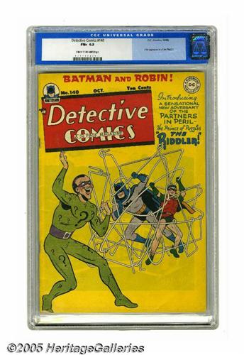 <B>Detective Comics #140 (DC, 1948) CGC FN+ 6.5 Cream to off-white pages.</B></I> The Riddler made his first appearance here, in fact, it's one of only two Golden Age appearances for the character! Of course, once the "Batman" TV show came along in the 1960s, the King of Conundrums was catapulted into the top tier of Bat-Villains. In this issue, we find out how a small-time scam artist became the Prince of Puzzlers and the Emir of Enigmas. The Riddler is drawn by Win Mortimer on the cover and Dick Sprang inside the comic. Also worthy of note is a Boy Commandos backup feature. Overstreet 2005 FN 6.0 value = $1,317; VF 8.0 value = $3,073. CGC census 6/05: 3 in 6.5, 8 higher.