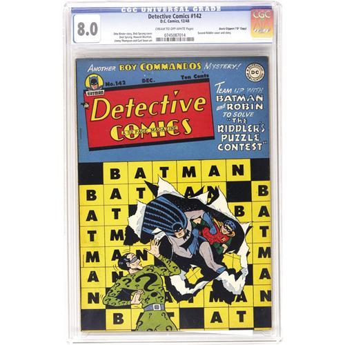 <B>Detective Comics #142 Davis Crippen ("D" Copy) pedigree (DC, 1948) CGC VF 8.0 Cream to off-white pages.</B></I> This was the Riddler's last appearance for 17 years! And it's also just his second appearance overall. In this issue, the Emir of Enigmas stages a series of puzzle contests, with his goal being to rip off the contestants in various ways... a job for Batman, naturally. The issue's cover and the art on the Batman story are by Dick Sprang; there's also a Boy Commandos adventure with Curt Swan art. Overstreet 2006 VF 8.0 value = $750. CGC census 6/06: 1 in 8.0, 1 higher. <I>From the Crippen Collection.</B></I> <BR><BR><B>Important notice:</B> Heritage usually auctions material at the rate of 200-250 lots per hour. On some occasions eBay Live bid software or the Internet may not be able to keep up with the pace of the auction. We recommend placing a realistic absentee bid now as insurance to avoid disappointment. Occasionally the auctioneer may eliminate or reject an eBay Live bid, and the auctioneer may also reopen a lot after the close of the eBay live bidding (usually because we missed an audience bid), and may reject your bid even if it shows you as the winning bidder. By bidding via eBay Live, you agree that Heritage may award the lot to another bidder at its sole discretion under the circumstances described above or any other reasonable circumstances. Since eBay bids are not shown to us until we open the lot on the floor, we treat those bids just like floor bids. In most cases the floor responds before the eBay bid is presented to us, due to Internet lag time, so for consistency we have made it a policy that floor bids are always considered first over tie eBay live bids. Also please note that all Heritage lots purchased through eBay Live carry a 22.5% Buyer's Premium. Please make sure you read the Terms and Conditions before you bid. This lot is being auctioned in conjunction with a live floor auction by Heritage Auction Galleries. All final auction and invoice information will be supplied by Heritage Auction Galleries, and all other information should be considered preliminary. Lot:41001 <BR><BR><B>Winning Notification and Billing:</B> After the FINAL session in this auction is complete, Heritage will send e-mail and snail mail invoices. This process normally takes several days. All final auction and invoice information will be supplied by Heritage Auction Galleries, and all other information should be considered preliminary. <BR><BR>This auction will be conducted on a live auction floor and over the Internet through eBay Live. If you choose to place an absentee bid, please take a moment to <font color='#0000ff'><u><a href='http://pages.ebay.com/liveauctions/help/before/laabsentee.html'>learn how eBay Live absentee bidding works</a></u></font><font color='#000000'>