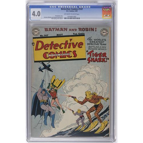 <B>Detective Comics #147 (DC, 1949) CGC VG 4.0 Off-white to white pages.</B></I> Dick Sprang cover and art. Overstreet 2006 VG 4.0 value = $124. CGC census 1/06: 1 in 4.0, 2 higher. <I>From the Collection of Harold Curtis.</B></I>