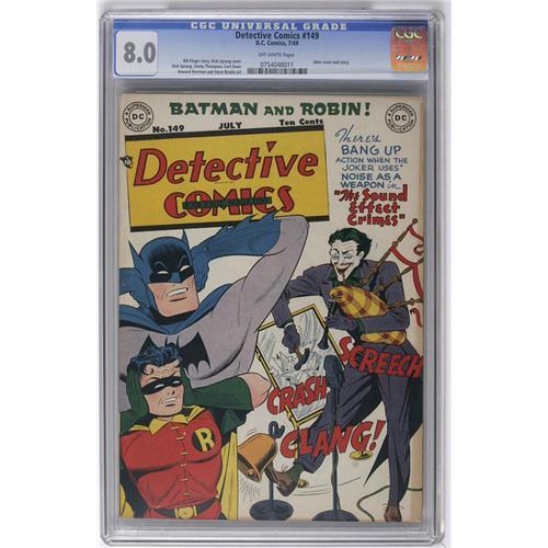 <B>Detective Comics #149 (DC, 1949) CGC VF 8.0 Off-white pages.</B></I> Joker time! That Mirthful Mountebank is back, and his new scheme to line his pockets is to use realistic sound effects to fool the authorities while he pulls off his crimes. The cover and art are by Dick Sprang. There's also a Boy Commandos story with Curt Swan art. Overstreet 2006 VF 8.0 value = $519. CGC census 1/06: 1 in 8.0, 2 higher. <I>From the Collection of Harold Curtis.</B></I>