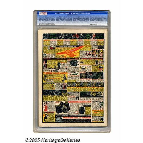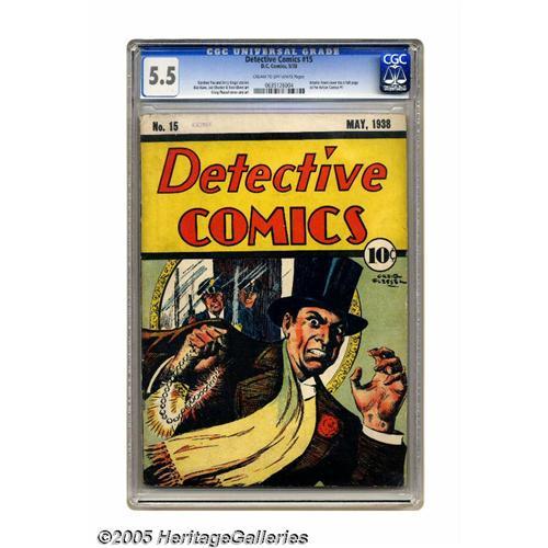 <B>Detective Comics #15 (DC, 1938) CGC FN- 5.5 Cream to off-white pages.</B></I> An indication of just how early in the history of comics this issue was is the inside front cover -- it's a full-page ad for " "<B>Action Comics</B></I> #1! And though Batman was still just a twinkle in Bob Kane's eye at this time, Kane was already contributing to " <B>Detective</B></I> -- he drew a one-page humor feature for this very issue. Other artists in the issue include Creig Flessel (who also drew the cover) and Joe Shuster (whose "<B>Action</B></I> duties didn't keep him from penciling Spy and Slam Bradley stories here). Overstreet 2005 FN 6.0 value = 1,575. CGC census 9/05: 2 in 5.5, 1 higher. <BR><BR><B>Important notice:</B> Heritage usually auctions material at the rate of 200-250 lots per hour. On some occasions eBay Live bid software or the Internet may not be able to keep up with the pace of the auction. We recommend placing a realistic absentee bid now as insurance to avoid disappointment. Occasionally the auctioneer may eliminate or reject an eBay Live bid, and the auctioneer may also reopen a lot after the close of the eBay live bidding (usually because we missed an audience bid), and may reject your bid even if it shows you as the winning bidder. By bidding via eBay Live, you agree that Heritage may award the lot to another bidder at its sole discretion under the circumstances described above or any other reasonable circumstances. Since eBay bids are not shown to us until we open the lot on the floor, we treat those bids just like floor bids. In most cases the floor responds before the eBay bid is presented to us, due to Internet lag time, so for consistency we have made it a policy that floor bids are always considered first over tie eBay live bids. Also please note that all Heritage lots purchased through eBay Live carry a 20% Buyer's Premium. Please make sure you read the Terms and Conditions before you bid. This lot is being auctioned in conjunction with a live