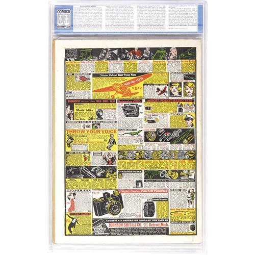 <B>Detective Comics #15 (DC, 1938) CGC VG+ 4.5 Cream pages.</B></I> Cover artist Creig Flessel had a knack for drawing debonair characters, be they heroes or villains! In addition to portraying a well-tailored jewel thief here, Flessel contributed interior art to the issue. Other contributors include future Batman creator Bob Kane, who drew a humor feature, and Superman creators Jerry Siegel and Joe Shuster, who drew two stories. Speaking of Superman, the inside front cover of this issue has a full-page ad for <B>Action Comics</B></I> #1. CGC notes, "Moderate pieces out of the margin of most pages, does not affect story." Overstreet 2006 VG 4.0 value = $1,050. CGC census 5/06: 1 in 4.5, 3 higher. <I>From the collection of Patrick Marchbanks.</B></I> <BR><BR><B>Important notice:</B> Heritage usually auctions material at the rate of 200-250 lots per hour. On some occasions eBay Live bid software or the Internet may not be able to keep up with the pace of the auction. We recommend placing a realistic absentee bid now as insurance to avoid disappointment. Occasionally the auctioneer may eliminate or reject an eBay Live bid, and the auctioneer may also reopen a lot after the close of the eBay live bidding (usually because we missed an audience bid), and may reject your bid even if it shows you as the winning bidder. By bidding via eBay Live, you agree that Heritage may award the lot to another bidder at its sole discretion under the circumstances described above or any other reasonable circumstances. Since eBay bids are not shown to us until we open the lot on the floor, we treat those bids just like floor bids. In most cases the floor responds before the eBay bid is presented to us, due to Internet lag time, so for consistency we have made it a policy that floor bids are always considered first over tie eBay live bids. Also please note that all Heritage lots purchased through eBay Live carry a 22.5% Buyer's Premium. Please make sure you read the Terms and Conditions before you bid. This lot is being auctioned in conjunction with a live floor auction by Heritage Auction Galleries. All final auction and invoice information will be supplied by Heritage Auction Galleries, and all other information should be considered preliminary. Lot:41001 <BR><BR><B>Winning Notification and Billing:</B> After the FINAL session in this auction is complete, Heritage will send e-mail and snail mail invoices. This process normally takes several days. All final auction and invoice information will be supplied by Heritage Auction Galleries, and all other information should be considered preliminary. <BR><BR>This auction will be conducted on a live auction floor and over the Internet through eBay Live. If you choose to place an absentee bid, please take a moment to <font color='#0000ff'><u><a href='http://pages.ebay.com/liveauctions/help/before/laabsentee.html'>learn how eBay Live absentee bidding works</a></u></font><font color='#000000'>