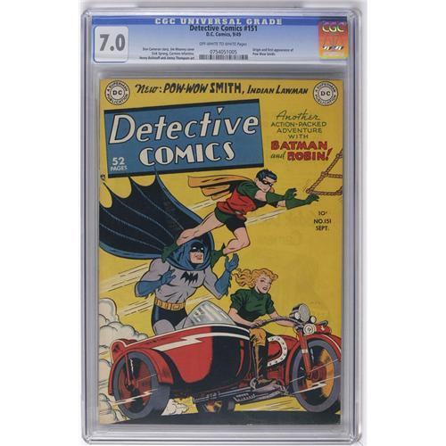 <B>Detective Comics #151 (DC, 1949) CGC FN/VF 7.0 Off-white to white pages.</B></I> Jim Mooney drew the Caped Crusader on this issue's cover, and Dick Sprang handled interior art on the Batman story. This issue marked a changeover when it came to backup features: in 1949, war stories were out and Westerns were in, so the Boy Commandos were replaced by Pow-Wow Smith, Indian Lawman, who made his first appearance in this issue (his origin story was told here as well). The character remained a fixture in this title all the way through issue #202. Overstreet 2006 FN 6.0 value = $228; VF 8.0 value = $475. CGC census 1/06: 2 in 7.0, 3 higher. <I>From the Collection of Harold Curtis.</B></I>
