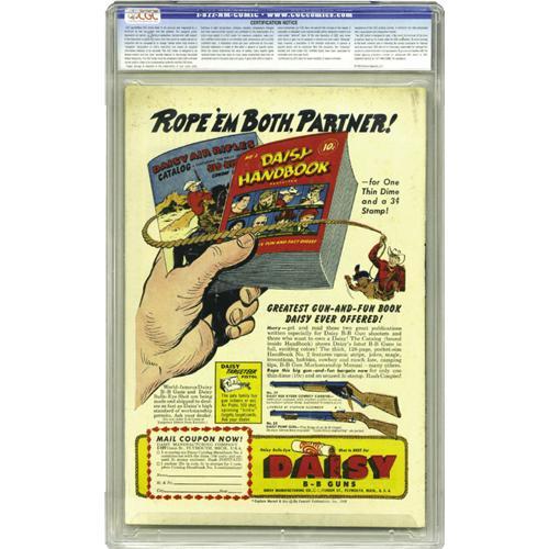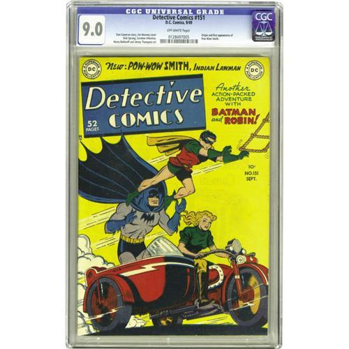 <B>Detective Comics #151 (DC, 1949) CGC VF/NM 9.0 Off-white pages.</B></I> Pow-Wow Smith, Indian Lawman, a long-running backup feature in this title, made his first appearance in this issue, which also relates his origin story. Naturally, there's also a Batman story here, drawn by Dick Sprang. And there's a great Jim Mooney cover to get things started. Overstreet 2006 VF/NM 9.0 value = $750; NM- 9.2 value = $1,025. CGC census 5/06: 1 in 9.0, 1 higher. <BR><BR><B>Important notice:</B> Heritage usually auctions material at the rate of 200-250 lots per hour. On some occasions eBay Live bid software or the Internet may not be able to keep up with the pace of the auction. We recommend placing a realistic absentee bid now as insurance to avoid disappointment. Occasionally the auctioneer may eliminate or reject an eBay Live bid, and the auctioneer may also reopen a lot after the close of the eBay live bidding (usually because we missed an audience bid), and may reject your bid even if it shows you as the winning bidder. By bidding via eBay Live, you agree that Heritage may award the lot to another bidder at its sole discretion under the circumstances described above or any other reasonable circumstances. Since eBay bids are not shown to us until we open the lot on the floor, we treat those bids just like floor bids. In most cases the floor responds before the eBay bid is presented to us, due to Internet lag time, so for consistency we have made it a policy that floor bids are always considered first over tie eBay live bids. Also please note that all Heritage lots purchased through eBay Live carry a 22.5% Buyer's Premium. Please make sure you read the Terms and Conditions before you bid. This lot is being auctioned in conjunction with a live floor auction by Heritage Auction Galleries. All final auction and invoice information will be supplied by Heritage Auction Galleries, and all other information should be considered preliminary. Lot:41001 <BR><BR><B>Winning Notification and Billing:</B> After the FINAL session in this auction is complete, Heritage will send e-mail and snail mail invoices. This process normally takes several days. All final auction and invoice information will be supplied by Heritage Auction Galleries, and all other information should be considered preliminary. <BR><BR>This auction will be conducted on a live auction floor and over the Internet through eBay Live. If you choose to place an absentee bid, please take a moment to <font color='#0000ff'><u><a href='http://pages.ebay.com/liveauctions/help/before/laabsentee.html'>learn how eBay Live absentee bidding works</a></u></font><font color='#000000'>