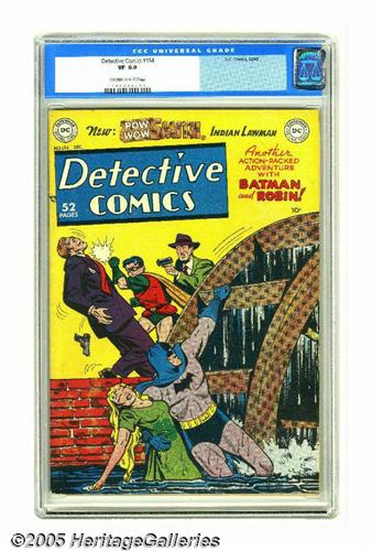 <B>Detective Comics #154 (DC, 1949) CGC VF 8.0 Off-white to white pages.</B></I> In this issue, Batman and Robin bust up an "Underground Railroad of Crime" that's been helping criminals escape. The art is a Bob Kane/Charles Paris collaboration, and the cover's by Jim Mooney. The issue also features an adventure of "Pow-Wow Smith, Indian Lawman," with art by Carmine Infantino. Overstreet 2005 VF 8.0 value = $388. CGC census 3/05: 1 in 8.0, 2 higher.