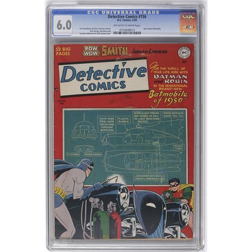 <B>Detective Comics #156 (DC, 1950) CGC FN 6.0 Off-white to white pages.</B></I> Debut of the new Batmobile (streamlined with plastic-bubble top). Dick Sprang cover and art. Pow Wow Smith backup feature with Carmine Infantino art. Overstreet 2006 FN 6.0 value = $261. CGC census 1/06: 1 in 6.0, 2 higher. <I>From the Collection of Harold Curtis.</B></I>