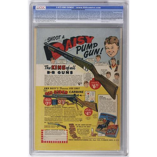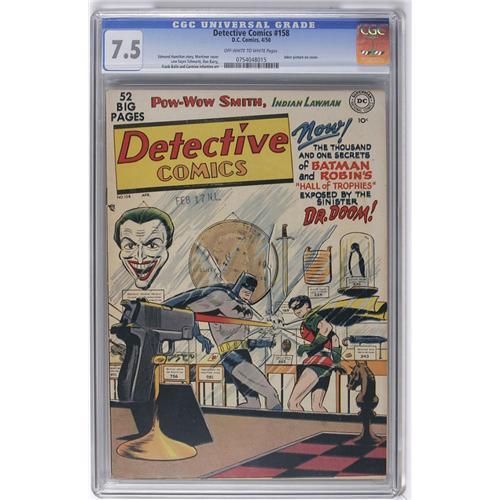 <B>Detective Comics #158 (DC, 1950) CGC VF- 7.5 Off-white to white pages.</B></I> No true Bat-fan can get enough of the Batcave, and of course, the best part of the Batcave is the famous trophy room! This issue's "The Thousand and One Trophies of Batman" has a similar setup to the classic "The 1,000 Secrets of the Batcave" in <B>Batman</B></I> #48 a couple of years earlier, namely that a bad guy sneaks into said hideout and starts messing with the items found there. No, the villain isn't the Joker (that's just a Joker <I>mask</B></I> on Win Mortimer's cover), but rather a fellow named... Dr. Doom! No copy of this issue has been graded above 8.5 by CGC to date, putting this copy from Harold Curtis' collection close on the heels of the best known specimens. Overstreet 2006 VF 8.0 value = $388. CGC census 1/06: 1 in 7.5, 3 higher. <I>From the Collection of Harold Curtis.</B></I>