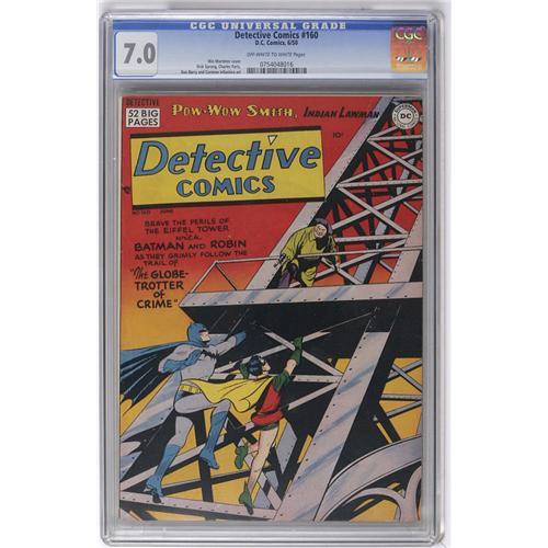 <B>Detective Comics #160 (DC, 1950) CGC FN/VF 7.0 Off-white to white pages.</B></I> This is the first time we've offered this issue, and it's one of a mere four that have been certified by CGC as of this writing, bearing out our oft-mentioned belief that the early 1950s issues of this title are harder to come by than the 1940s books. In the issue, Batman and Robin head for England and France to defeat the Globetrotter (who sports the exact same purple <I>chapeau</B></I> as Silver Age Marvel baddie Paste-Pot Pete!). Win Mortimer drew the issue's cover, Dick Sprang handled interior art on Batman, and Carmine Infantino drew a tale of Pow-Wow Smith. Overstreet 2006 FN 6.0 value = $186; VF 8.0 value = $388. CGC census 2/06: 1 in 7.0, 2 higher. <I>From the Collection of Harold Curtis.</B></I>