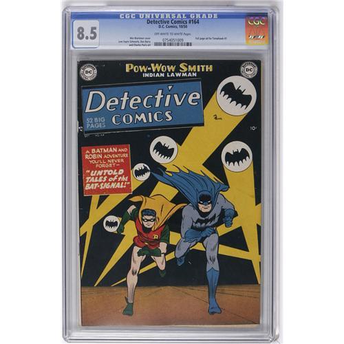 <B>Detective Comics #164 (DC, 1950) CGC VF+ 8.5 Off-white to white pages.</B></I> Lots of previously unknown information on the Bat-Signal was brought to light in this issue! For instance, how did the police use it in wartime when there was a blackout? All of this is revealed, and of course there's a criminal to thwart, with the Bat-Signal playing a part in catching him. Win Mortimer drew the cover, and Lew Schwartz and Charles Paris teamed up on the interior art. Of course, Bat-Signal covers mean <I>black</B></I> covers, and that means "hard to find in high grade." This VF+ copy is bested by only a few others in CGC's census. Overstreet 2006 VF 8.0 value = $350; VF/NM 9.0 value = $555. CGC census 1/06: 1 in 8.5, 4 higher. <I>From the Collection of Harold Curtis.</B></I>