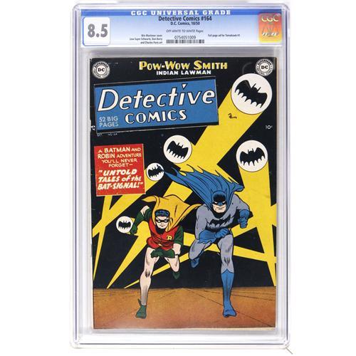 <B>Detective Comics #164 (DC, 1950) CGC VF+ 8.5 Off-white to white pages.</B></I> Lots of previously unknown information on the Bat-Signal was brought to light in this issue! For instance, how did the police use it in wartime when there was a blackout? All of this is revealed, and of course there's a criminal to thwart, with the Bat-Signal playing a part in catching him. Win Mortimer drew the cover, and Lew Schwartz and Charles Paris teamed up on the interior art. Of course, Bat-Signal covers mean <I>black</B></I> covers, and that means "hard to find in high grade." This VF+ copy is bested by only a few others in CGC's census. Overstreet 2006 VF 8.0 value = $350; VF/NM 9.0 value = $555. CGC census 7/06: 1 in 8.5, 4 higher. <BR><BR><B>Important notice:</B> Heritage usually auctions material at the rate of 200-250 lots per hour. On some occasions eBay Live bid software or the Internet may not be able to keep up with the pace of the auction. We recommend placing a realistic absentee bid now as insurance to avoid disappointment. Occasionally the auctioneer may eliminate or reject an eBay Live bid, and the auctioneer may also reopen a lot after the close of the eBay live bidding (usually because we missed an audience bid), and may reject your bid even if it shows you as the winning bidder. By bidding via eBay Live, you agree that Heritage may award the lot to another bidder at its sole discretion under the circumstances described above or any other reasonable circumstances. Since eBay bids are not shown to us until we open the lot on the floor, we treat those bids just like floor bids. In most cases the floor responds before the eBay bid is presented to us, due to Internet lag time, so for consistency we have made it a policy that floor bids are always considered first over tie eBay live bids. Also please note that all Heritage lots purchased through eBay Live carry a 22.5% Buyer's Premium. Please make sure you read the Terms and Conditions before you bid. This lot is being auctioned in conjunction with a live floor auction by Heritage Auction Galleries. All final auction and invoice information will be supplied by Heritage Auction Galleries, and all other information should be considered preliminary. Lot:41001 <BR><BR><B>Winning Notification and Billing:</B> After the FINAL session in this auction is complete, Heritage will send e-mail and snail mail invoices. This process normally takes several days. All final auction and invoice information will be supplied by Heritage Auction Galleries, and all other information should be considered preliminary. <BR><BR>This auction will be conducted on a live auction floor and over the Internet through eBay Live. If you choose to place an absentee bid, please take a moment to <font color='#0000ff'><u><a href='http://pages.ebay.com/liveauctions/help/before/laabsentee.html'>learn how eBay Live absentee bidding works</a></u></font><font color='#000000'>