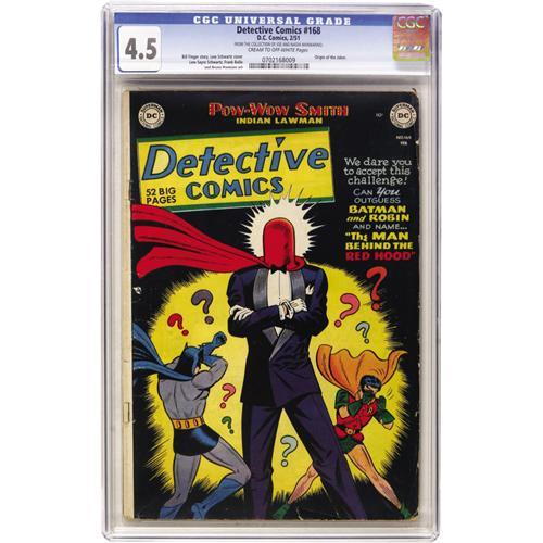 <B>Detective Comics #168 (DC, 1951) CGC VG+ 4.5 Cream to off-white pages.</B></I> The first origin of the Joker is rendered by Lew Schwartz who provided both the cover and interior art. Other interior art contributors were Bruno Premiani and Frank Bolle. CGC notes, "From the collection of Joe and Nadia Mannarino." Overstreet 2006 VG 4.0 value = $696. CGC census 3/07: 3 in 4.5, 14 higher.<BR><BR><b>Shipping:</b> Comics - Slabbed (certified) (<a target="_blank" href="http://www.heritageauctions.com/common/shipping.php">view shipping information</a>)