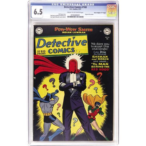 <B>Detective Comics #168 Davis Crippen ("D" Copy) pedigree (DC, 1951) CGC FN+ 6.5 Cream to off-white pages.</B></I> The origin of the Joker is revealed in this issue! And not only is this the only <I>Golden</B></I> Age telling of the origin, the Silver and Bronze Ages didn't add new information to the story... so while this book has a higher Guide value than the issues before and after it, it remains a major bargain as far as we're concerned! That "Red Hood" fellow on the cover is in fact the Joker, by the way. The cover art is credited to Lew Schwartz. Overstreet 2006 FN 6.0 value = $1,044; VF 8.0 value = $2,262. CGC census 6/06: 2 in 6.5, 9 higher. <I>From the Crippen Collection.</B></I> <BR><BR><B>Important notice:</B> Heritage usually auctions material at the rate of 200-250 lots per hour. On some occasions eBay Live bid software or the Internet may not be able to keep up with the pace of the auction. We recommend placing a realistic absentee bid now as insurance to avoid disappointment. Occasionally the auctioneer may eliminate or reject an eBay Live bid, and the auctioneer may also reopen a lot after the close of the eBay live bidding (usually because we missed an audience bid), and may reject your bid even if it shows you as the winning bidder. By bidding via eBay Live, you agree that Heritage may award the lot to another bidder at its sole discretion under the circumstances described above or any other reasonable circumstances. Since eBay bids are not shown to us until we open the lot on the floor, we treat those bids just like floor bids. In most cases the floor responds before the eBay bid is presented to us, due to Internet lag time, so for consistency we have made it a policy that floor bids are always considered first over tie eBay live bids. Also please note that all Heritage lots purchased through eBay Live carry a 22.5% Buyer's Premium. Please make sure you read the Terms and Conditions before you bid. This lot is being auctioned in conjunction with a live floor auction by Heritage Auction Galleries. All final auction and invoice information will be supplied by Heritage Auction Galleries, and all other information should be considered preliminary. Lot:41001 <BR><BR><B>Winning Notification and Billing:</B> After the FINAL session in this auction is complete, Heritage will send e-mail and snail mail invoices. This process normally takes several days. All final auction and invoice information will be supplied by Heritage Auction Galleries, and all other information should be considered preliminary. <BR><BR>This auction will be conducted on a live auction floor and over the Internet through eBay Live. If you choose to place an absentee bid, please take a moment to <font color='#0000ff'><u><a href='http://pages.ebay.com/liveauctions/help/before/laabsentee.html'>learn how eBay Live absentee bidding works</a></u></font><font color='#000000'>