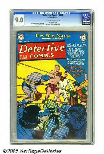 <B>Detective Comics #174 (DC, 1951) CGC VF/NM 9.0 Off-white to white pages.</B></I> This issue's worth grabbing for the cover alone -- how often do you see Batman without his cape? In the story, Bruce Wayne suspects corruption in boxing matches (the very idea is absurd, eh?) and decides to investigate. The issue's cover is by Win Mortimer. Overstreet 2005 VF/NM 9.0 value = $538; NM- 9.2 value = $725. CGC census 3/05: 1 in 9.0, 1 higher.