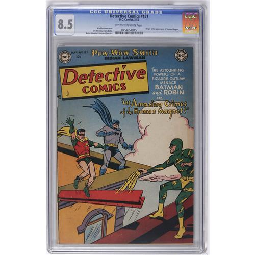 <B>Detective Comics #181 (DC, 1952) CGC VF+ 8.5 Off-white to white pages.</B></I> These early '50s <B>Detective</B></I>s seem to be the hardest ones to find, and this copy's among the nicer ones yet certified. The first appearance, origin, and, well, last appearance of the Human Magnet are all in this issue. Win Mortimer drew the magnetic one-story wonder on the cover, and Jim Mooney handled the art on the story itself. Overstreet 2006 VF 8.0 value = $317; VF/NM 9.0 value = $496. CGC census 2/06: 1 in 8.5, 2 higher. <I>From the Collection of Harold Curtis.</B></I>
