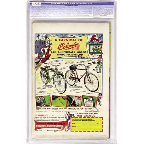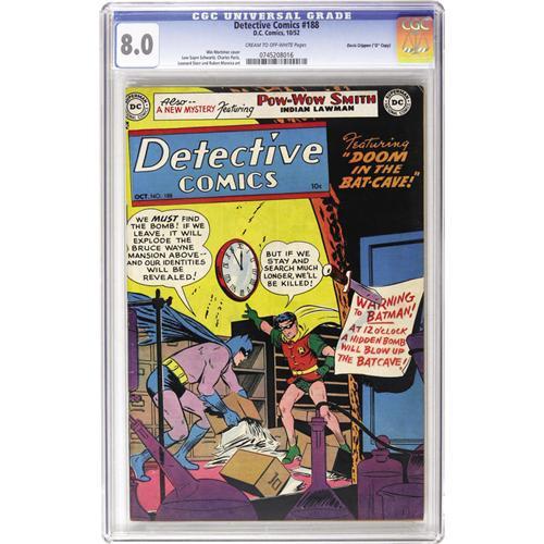 <B>Detective Comics #188 Davis Crippen ("D" Copy) pedigree (DC, 1952) CGC VF 8.0 Cream to off-white pages.</B></I> Here's yet another of those tough-to-find early-1950s superhero books, and it's the highest-graded specimen, at that. The cover's got the kind of "sticky situation" cover you'd associate more with a Silver Age issue, and it's Win Mortimer handling art chores. Robotman and Pow-Wow Smith are the backup features. Overstreet 2006 VF 8.0 value = $317. CGC census 6/06: 1 in 8.0, none higher. <I>From the Crippen Collection.</B></I> <BR><BR><B>Important notice:</B> Heritage usually auctions material at the rate of 200-250 lots per hour. On some occasions eBay Live bid software or the Internet may not be able to keep up with the pace of the auction. We recommend placing a realistic absentee bid now as insurance to avoid disappointment. Occasionally the auctioneer may eliminate or reject an eBay Live bid, and the auctioneer may also reopen a lot after the close of the eBay live bidding (usually because we missed an audience bid), and may reject your bid even if it shows you as the winning bidder. By bidding via eBay Live, you agree that Heritage may award the lot to another bidder at its sole discretion under the circumstances described above or any other reasonable circumstances. Since eBay bids are not shown to us until we open the lot on the floor, we treat those bids just like floor bids. In most cases the floor responds before the eBay bid is presented to us, due to Internet lag time, so for consistency we have made it a policy that floor bids are always considered first over tie eBay live bids. Also please note that all Heritage lots purchased through eBay Live carry a 22.5% Buyer's Premium. Please make sure you read the Terms and Conditions before you bid. This lot is being auctioned in conjunction with a live floor auction by Heritage Auction Galleries. All final auction and invoice information will be supplied by Heritage Auction Galleries, and all other information should be considered preliminary. Lot:41001 <BR><BR><B>Winning Notification and Billing:</B> After the FINAL session in this auction is complete, Heritage will send e-mail and snail mail invoices. This process normally takes several days. All final auction and invoice information will be supplied by Heritage Auction Galleries, and all other information should be considered preliminary. <BR><BR>This auction will be conducted on a live auction floor and over the Internet through eBay Live. If you choose to place an absentee bid, please take a moment to <font color='#0000ff'><u><a href='http://pages.ebay.com/liveauctions/help/before/laabsentee.html'>learn how eBay Live absentee bidding works</a></u></font><font color='#000000'>