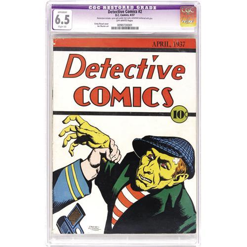 <B>Detective Comics #2 (DC, 1937) CGC Apparent FN+ 6.5 Slight (A) Off-white pages.</B></I> This second issue is even tougher to find than #1 - it's a Gerber "9" and is also called "rare" by Overstreet, who ranks it among the 100 most valuable Golden Age books. As was the case for #1, this issue has multiple detective features, the most notable of which are Slam Bradley, who never missed a <B>Detective</B></I> in the early years, and "Bart Regan, Spy." Both of those characters' features were written by Jerry Siegel and drawn by Joe Shuster; those were of course the creators who would soon produce Superman. The simple but striking cover is by ace artist Creig Flessel. CGC notes, "Restoration includes: spine split sealed, tear seals, centerfold reinforced with glue." Overstreet 2006 GD 2.0 value = $2,450; VG 4.0 value = $4,900; FN 6.0 value = $7,350; VF 8.0 value = $17,200. <I>From the collection of Patrick Marchbanks.</B></I> <BR><BR><B>Important notice:</B> Heritage usually auctions material at the rate of 200-250 lots per hour. On some occasions eBay Live bid software or the Internet may not be able to keep up with the pace of the auction. We recommend placing a realistic absentee bid now as insurance to avoid disappointment. Occasionally the auctioneer may eliminate or reject an eBay Live bid, and the auctioneer may also reopen a lot after the close of the eBay live bidding (usually because we missed an audience bid), and may reject your bid even if it shows you as the winning bidder. By bidding via eBay Live, you agree that Heritage may award the lot to another bidder at its sole discretion under the circumstances described above or any other reasonable circumstances. Since eBay bids are not shown to us until we open the lot on the floor, we treat those bids just like floor bids. In most cases the floor responds before the eBay bid is presented to us, due to Internet lag time, so for consistency we have made it a policy that floor bids are always considered first over tie eBay live bids. Also please note that all Heritage lots purchased through eBay Live carry a 22.5% Buyer's Premium. Please make sure you read the Terms and Conditions before you bid. This lot is being auctioned in conjunction with a live floor auction by Heritage Auction Galleries. All final auction and invoice information will be supplied by Heritage Auction Galleries, and all other information should be considered preliminary. Lot:41001 <BR><BR><B>Winning Notification and Billing:</B> After the FINAL session in this auction is complete, Heritage will send e-mail and snail mail invoices. This process normally takes several days. All final auction and invoice information will be supplied by Heritage Auction Galleries, and all other information should be considered preliminary. <BR><BR>This auction will be conducted on a live auction floor and over the Internet through eBay Live. If you choose to place an absentee bid, please take a moment to <font color='#0000ff'><u><a href='http://pages.ebay.com/liveauctions/help/before/laabsentee.html'>learn how eBay Live absentee bidding works</a></u></font><font color='#000000'>