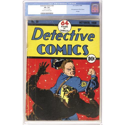 <B>Detective Comics #20 (DC, 1938) CGC VG- 3.5 Cream to off-white pages.</B></I> The first <B>Detective Comics</B></I> superhero debuted in this issue! No, it's not Batman, it's the Crimson Avenger. This costumed crusader, somewhat similar to the Green Hornet, was a regular in this title through issue #89. The rest of the issue features the usual lineup of P.I.s and cops, and boasts a (literally) striking cover by Leo O'Mealia. CGC notes, "One-inch tear on 1st 3 pages." Overstreet 2006 VG 4.0 value = $1,576. CGC census 5/06: 1 in 3.5, 4 higher. <I>From the collection of Patrick Marchbanks.</B></I> <BR><BR><B>Important notice:</B> Heritage usually auctions material at the rate of 200-250 lots per hour. On some occasions eBay Live bid software or the Internet may not be able to keep up with the pace of the auction. We recommend placing a realistic absentee bid now as insurance to avoid disappointment. Occasionally the auctioneer may eliminate or reject an eBay Live bid, and the auctioneer may also reopen a lot after the close of the eBay live bidding (usually because we missed an audience bid), and may reject your bid even if it shows you as the winning bidder. By bidding via eBay Live, you agree that Heritage may award the lot to another bidder at its sole discretion under the circumstances described above or any other reasonable circumstances. Since eBay bids are not shown to us until we open the lot on the floor, we treat those bids just like floor bids. In most cases the floor responds before the eBay bid is presented to us, due to Internet lag time, so for consistency we have made it a policy that floor bids are always considered first over tie eBay live bids. Also please note that all Heritage lots purchased through eBay Live carry a 22.5% Buyer's Premium. Please make sure you read the Terms and Conditions before you bid. This lot is being auctioned in conjunction with a live floor auction by Heritage Auction Galleries. All final auction and invoice information will be supplied by Heritage Auction Galleries, and all other information should be considered preliminary. Lot:41001 <BR><BR><B>Winning Notification and Billing:</B> After the FINAL session in this auction is complete, Heritage will send e-mail and snail mail invoices. This process normally takes several days. All final auction and invoice information will be supplied by Heritage Auction Galleries, and all other information should be considered preliminary. <BR><BR>This auction will be conducted on a live auction floor and over the Internet through eBay Live. If you choose to place an absentee bid, please take a moment to <font color='#0000ff'><u><a href='http://pages.ebay.com/liveauctions/help/before/laabsentee.html'>learn how eBay Live absentee bidding works</a></u></font><font color='#000000'>