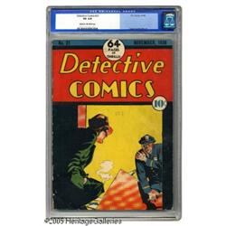 <B>Detective Comics #21 (DC, 1938) CGC VG 4.0 Cream to off-white pages.</B></I> Most comic fans would be surprised to hear that there was a superhero in <B>Detective Comics</B></I> who preceded Batman. His name was the Crimson Avenger, and he made only his second appearance in this issue. The book has a Leo O'Mealia cover, with interior art by such luminaries as Fred Guardineer and Joe Shuster. One other notable feature is an installment of the ongoing adaptation of Sax Rohmer's <B>The Insidious Dr. Fu Manchu</B></I>. This is the highest-graded unrestored copy of the issue that CGC has certified to date. Overstreet 2004 VG 4.0 value = $824. CGC census 12/04: CGC census 12/04: 2 in 4.0, none higher. <I>From the Northern Lights Collection.</B></I>