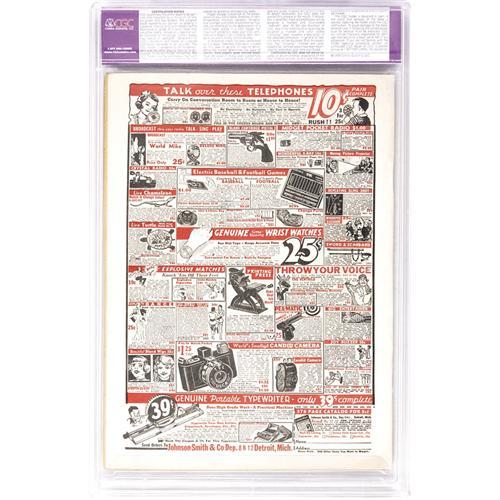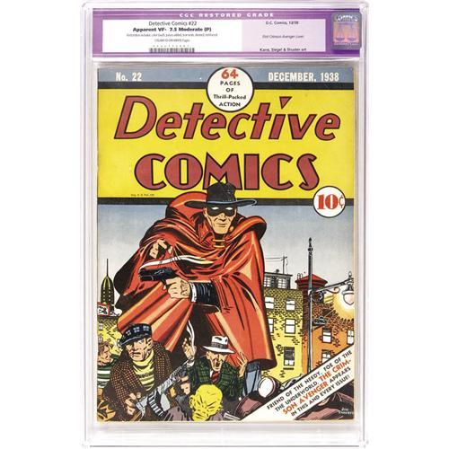 <B>Detective Comics #22 (DC, 1938) CGC Apparent VF- 7.5 Moderate (P) Cream to off-white pages.</B></I> We've waited a long time to get our hands on this issue, and we assume you share our sentiments, as we know of no other copy that's changed hands in any venue lately! It's the first superhero cover ever for <B>Detective Comics</B></I>, and the only time the Crimson Avenger ever appeared on a cover in this series. The cover art by Jim Chambers is dynamite, too! Plus this copy presents extremely well, thanks to careful professional restoration. Inside the issue, there's the work of some creators we associate more with superheroes, Bob Kane (who drew a "comedy detective" bit) and Jerry Siegel and Joe Shuster (who handled the "Slam Bradley" and "Spy" stories). Overstreet 2006 GD 2.0 value = $538; VG 4.0 value = $1,076; FN 6.0 value = $1,614; VF 8.0 value = $2,690. <I>From the collection of Patrick Marchbanks.</B></I> <BR><BR><B>Important notice:</B> Heritage usually auctions material at the rate of 200-250 lots per hour. On some occasions eBay Live bid software or the Internet may not be able to keep up with the pace of the auction. We recommend placing a realistic absentee bid now as insurance to avoid disappointment. Occasionally the auctioneer may eliminate or reject an eBay Live bid, and the auctioneer may also reopen a lot after the close of the eBay live bidding (usually because we missed an audience bid), and may reject your bid even if it shows you as the winning bidder. By bidding via eBay Live, you agree that Heritage may award the lot to another bidder at its sole discretion under the circumstances described above or any other reasonable circumstances. Since eBay bids are not shown to us until we open the lot on the floor, we treat those bids just like floor bids. In most cases the floor responds before the eBay bid is presented to us, due to Internet lag time, so for consistency we have made it a policy that floor bids are always considered first over tie eBay live bids. Also please note that all Heritage lots purchased through eBay Live carry a 22.5% Buyer's Premium. Please make sure you read the Terms and Conditions before you bid. This lot is being auctioned in conjunction with a live floor auction by Heritage Auction Galleries. All final auction and invoice information will be supplied by Heritage Auction Galleries, and all other information should be considered preliminary. Lot:41001 <BR><BR><B>Winning Notification and Billing:</B> After the FINAL session in this auction is complete, Heritage will send e-mail and snail mail invoices. This process normally takes several days. All final auction and invoice information will be supplied by Heritage Auction Galleries, and all other information should be considered preliminary. <BR><BR>This auction will be conducted on a live auction floor and over the Internet through eBay Live. If you choose to place an absentee bid, please take a moment to <font color='#0000ff'><u><a href='http://pages.ebay.com/liveauctions/help/before/laabsentee.html'>learn how eBay Live absentee bidding works</a></u></font><font color='#000000'>