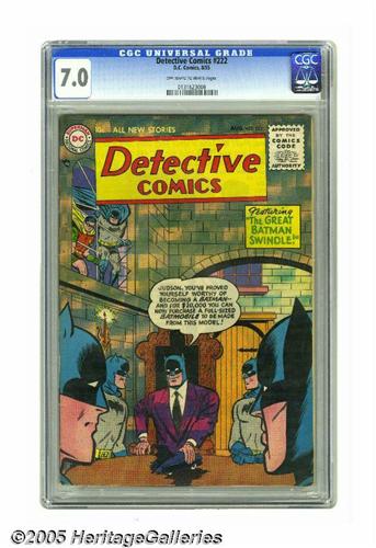 <B>Detective Comics #222 (DC, 1955) CGC FN/VF 7.0 Off-white to white pages.</B></I> These early-1950s issues are tough to find -- we hadn't seen this particular issue before today, and our copy is one of only four that CGC has certified. In the wacky story drawn by Dick Sprang, four con artists dupe a businessman into thinking there's a "Brotherhood of the Batman," and that there are actually four different Caped Crusaders working in shifts. It's up to the real Batman to clear things up. The cover is by Win Mortimer. Overstreet 2005 FN 6.0 value = $136; VF 8.0 value = $275. CGC census 6/05: 1 in 7.0, 1 higher.