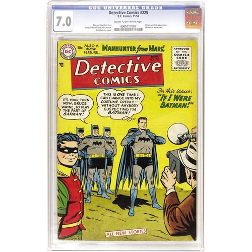 <B>Detective Comics #225 (DC, 1955) CGC FN/VF 7.0 Cream to off-white pages.</B></I> Some fans call this issue the first comic book of the Silver Age, as it has the first appearance of the Manhunter from Mars, and thus the first significant introduction of a new superhero in the 1950s. The story with the Martian Manhunter (as he's better known today) was drawn by Joe Certa. J'onn J'onzz didn't get cover billing, though - this is <B>Detective</B></I>, after all! That means that Win Mortimer's cover was of course devoted to the Caped Crusader. The wacky Batman story (drawn by Sheldon Moldoff) has a bunch of average Joes getting to be Batman for a day. Overstreet 2006 FN 6.0 value = $1,095; VF 8.0 value = $3,340. CGC census 5/06: 5 in 7.0, 7 higher. <BR><BR><B>Important notice:</B> Heritage usually auctions material at the rate of 200-250 lots per hour. On some occasions eBay Live bid software or the Internet may not be able to keep up with the pace of the auction. We recommend placing a realistic absentee bid now as insurance to avoid disappointment. Occasionally the auctioneer may eliminate or reject an eBay Live bid, and the auctioneer may also reopen a lot after the close of the eBay live bidding (usually because we missed an audience bid), and may reject your bid even if it shows you as the winning bidder. By bidding via eBay Live, you agree that Heritage may award the lot to another bidder at its sole discretion under the circumstances described above or any other reasonable circumstances. Since eBay bids are not shown to us until we open the lot on the floor, we treat those bids just like floor bids. In most cases the floor responds before the eBay bid is presented to us, due to Internet lag time, so for consistency we have made it a policy that floor bids are always considered first over tie eBay live bids. Also please note that all Heritage lots purchased through eBay Live carry a 22.5% Buyer's Premium. Please make sure you read the Terms and Conditions before you bid. This lot is being auctioned in conjunction with a live floor auction by Heritage Auction Galleries. All final auction and invoice information will be supplied by Heritage Auction Galleries, and all other information should be considered preliminary. Lot:41001 <BR><BR><B>Winning Notification and Billing:</B> After the FINAL session in this auction is complete, Heritage will send e-mail and snail mail invoices. This process normally takes several days. All final auction and invoice information will be supplied by Heritage Auction Galleries, and all other information should be considered preliminary. <BR><BR>This auction will be conducted on a live auction floor and over the Internet through eBay Live. If you choose to place an absentee bid, please take a moment to <font color='#0000ff'><u><a href='http://pages.ebay.com/liveauctions/help/before/laabsentee.html'>learn how eBay Live absentee bidding works</a></u></font><font color='#000000'>