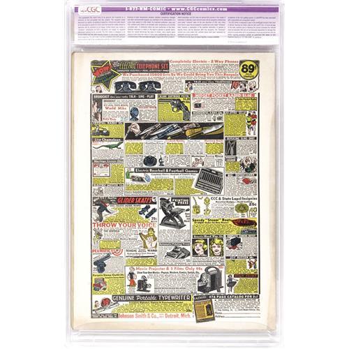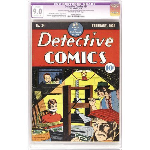 <B>Detective Comics #24 (DC, 1939) CGC Apparent VF/NM 9.0 Extensive (P) Off-white pages.</B></I> In our experience, this is one of the very toughest <B>Detective</B></I> issues to find, and Gerber was of the same opinion, assigning it a scarcity rating of "8." The cover art is by Fred Guardineer, who also drew the Speed Saunders feature inside the book. Other features include this series' first superhero the Crimson Avenger, a Fu Manchu story, some Bob Kane humor features, and more. CGC notes, "Restoration includes: color touch, pieces added, tear seals, cover cleaned, reinforced." Overstreet 2006 GD 2.0 value = $412; VG 4.0 value = $824; FN 6.0 value = $1,236; VF 8.0 value = $2,060; VF/NM 9.0 value = $2,880. <I>From the collection of Patrick Marchbanks.</B></I> <BR><BR><B>Important notice:</B> Heritage usually auctions material at the rate of 200-250 lots per hour. On some occasions eBay Live bid software or the Internet may not be able to keep up with the pace of the auction. We recommend placing a realistic absentee bid now as insurance to avoid disappointment. Occasionally the auctioneer may eliminate or reject an eBay Live bid, and the auctioneer may also reopen a lot after the close of the eBay live bidding (usually because we missed an audience bid), and may reject your bid even if it shows you as the winning bidder. By bidding via eBay Live, you agree that Heritage may award the lot to another bidder at its sole discretion under the circumstances described above or any other reasonable circumstances. Since eBay bids are not shown to us until we open the lot on the floor, we treat those bids just like floor bids. In most cases the floor responds before the eBay bid is presented to us, due to Internet lag time, so for consistency we have made it a policy that floor bids are always considered first over tie eBay live bids. Also please note that all Heritage lots purchased through eBay Live carry a 22.5% Buyer's Premium. Please make sure you read the Terms and Conditions before you bid. This lot is being auctioned in conjunction with a live floor auction by Heritage Auction Galleries. All final auction and invoice information will be supplied by Heritage Auction Galleries, and all other information should be considered preliminary. Lot:41001 <BR><BR><B>Winning Notification and Billing:</B> After the FINAL session in this auction is complete, Heritage will send e-mail and snail mail invoices. This process normally takes several days. All final auction and invoice information will be supplied by Heritage Auction Galleries, and all other information should be considered preliminary. <BR><BR>This auction will be conducted on a live auction floor and over the Internet through eBay Live. If you choose to place an absentee bid, please take a moment to <font color='#0000ff'><u><a href='http://pages.ebay.com/liveauctions/help/before/laabsentee.html'>learn how eBay Live absentee bidding works</a></u></font><font color='#000000'>