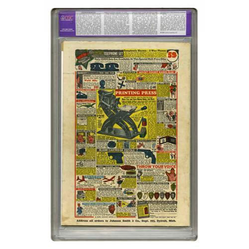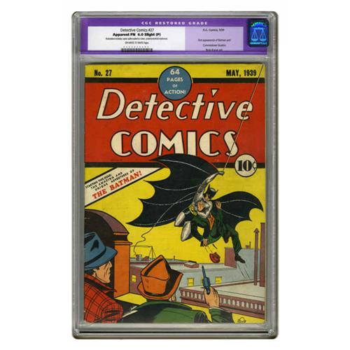 <B>Detective Comics #27 (DC, 1939) CGC Apparent FN 6.0 Slight (P) Off-white to white pages.</B></I> This historic comic book needs little in the way of introduction, but let us remind you that the Caped Crusader himself, Bob Kane's Batman, made his debut within these very pages, and has of course been going strong ever since. Overstreet ranks this book number two on its "Top Golden Age Books" listing, right behind <B>Action Comics</B></I> #1 with its introduction of Superman. Few comics generate the kind of excitement this classic key issue creates; it's truly a thrill just to hold this slabbed book in one's hands (as this trembling cataloger can now testify). Yes, this copy carries with it the dreaded purple "Restored" label, but please allow us to point out that the work done was only minor; CGC notes, "Restoration includes spine splits sealed to cover, cover/centerfold reinforced." That's it -- no pieces added, no color touch. This copy, showing only moderate wear, retains plenty of great eye-appeal, and would make a proud addition to any collection. Overstreet 2005 GD 2.0 value = $31,500; VG 4.0 value = $63,000; FN 6.0 value = $94,500.