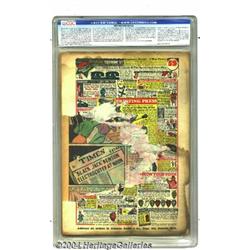 <B>Detective Comics #27 (DC, 1939) CGC FR 1.0 Light tan to off-white pages.</B></I> This milestone comic book remains one of the hottest collectibles of all, holding second place again this year in the updated Overstreet 2004 Top Golden Age Books list. Only <B>Action Comics</B></I> #1 outranks the book that introduced Batman in 1939. Co-creator Bob Kane provided the cover and the interior art on the Batman feature, in which Commissioner Gordon also makes his first appearance. You may find a nicer copy, but this one is complete save for the large chunk out of the back cover, and a small piece from the front. And even at FR 1.0, CGC's census lists just nine unrestored copies with higher grades to date, which makes Gerber's "uncommon" estimation ring true. A truly blue-chip comic classic. Overstreet 2004 GD 2.0 value = $31,250. <BR><BR><B>Important notice:</B> Heritage usually auctions material at the rate of 200-250 lots per hour. On some occasions eBay Live bid software or the Internet may not be able to keep up with the pace of the auction. We recommend placing a realistic absentee bid now as insurance to avoid disappointment. Occasionally the auctioneer may eliminate or reject an eBay Live bid, and the auctioneer may also reopen a lot after the close of the eBay live bidding (usually because we missed an audience bid), and may reject your bid even if it shows you as the winning bidder. By bidding via eBay Live, you agree that Heritage may award the lot to another bidder at its sole discretion under the circumstances described above or any other reasonable circumstances. Since eBay bids are not shown to us until we open the lot on the floor, we treat those bids just like floor bids. In most cases the floor responds before the eBay bid is presented to us, due to Internet lag time, so for consistency we have made it a policy that floor bids are always considered first over tie eBay live bids. Also please note that all Heritage lots purchased through eBay Live carry a 20% Buyer's Premium. Please make sure you read the Terms and Conditions before you bid.