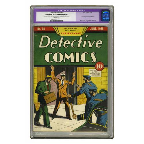 <B>Detective Comics #28 (DC, 1939) CGC Apparent VF 8.0 Extensive (P) Off-white pages.</B></I> Overstreet lists this issue, the second appearance of Batman, among the 50 most valuable Golden Age comic books. We actually see this issue less often than we see the famous #27! In the Caped Crusader's second appearance, the character is obviously still being developed: every mention of him calls him the "Bat-Man", quotation marks and all! Plus there's the fact that he doesn't even appear on Fred Guardineer's cover, which offers detective fare in the vein of the preceding issues. The book's interior artists include Guardineer (drawing the Speed Saunders story), Joe Shuster (once again collaborating with writer Jerry Siegel on both the Spy and Slam Bradley stories) and Jim Chambers (drawing the book's other superhero the Crimson Avenger). CGC notes, "Restoration includes: color touch, pieces added, tear seals, cleaned, reinforced." Overstreet 2005 GD 2.0 value = $1,765; VG 4.0 value = $3,530; FN 6.0 value = $5,295; VF 8.0 value = $13,400.
