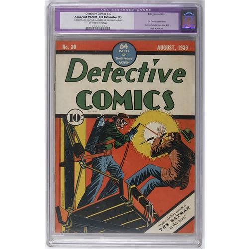 <B>Detective Comics #30 (DC, 1939) CGC Apparent VF/NM 9.0 Extensive (P) Off-white to white pages.</B></I> A Fred Guardineer cover and classic Bob Kane splash page are highlights of this early Batman issue. A Dr. Death story concludes from the previous issue. CGC has certified just three unrestored copies nicer than VF 8.0 to date, and no restored copy with a higher "Apparent" grade than this. CGC notes, "Restoration includes: color touch, pieces added, tear seals, cleaned, re-glossed." Overstreet 2006 GD 2.0 value = $727; VG 4.0 value = $1,454; FN 6.0 value = $2,181; VF 8.0 value = $5,089.