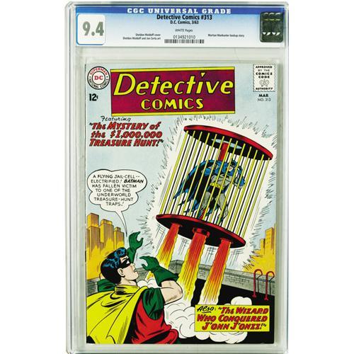 <B>Detective Comics #313 (DC, 1963) CGC NM 9.4 White pages.</B></I> Sheldon Moldoff handled the cover and interior art on the adventures of the Dynamic Duo here. As usual, the Martian Manhunter appears in a backup feature, with Joe Certa providing the art. Overstreet 2006 NM- 9.2 value = $115. CGC census 3/06: 4 in 9.4, none higher.