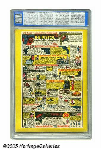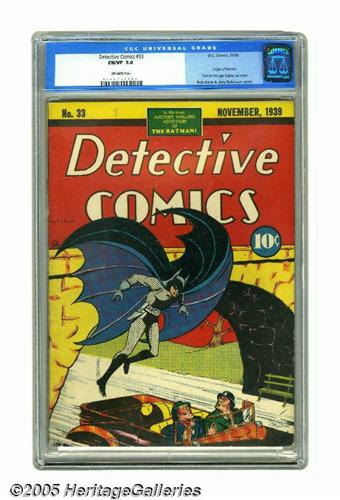<B>Detective Comics #33 (DC, 1939) CGC FN/VF 7.0 Off-white pages.</B></I> This issue is the twelfth most-valuable comic book of all according to Overstreet, and it's the second most-valuable issue of the title, ranking behind only the hallowed #27. The reason for all the fuss comes in the first two pages of the book: the first-ever telling of Batman's origin story. A look at the cover is enough to tell you how early in Batman's career this is: he's wearing a gun holster on the cover. He's got the holster in several panels of the story as well, and he even has a gun drawn in a couple of panels! The cover and art are by the Caped Crusader's creator Bob Kane, reportedly with an inking assist by Sheldon Moldoff. The backup features include the usual complement of detective tales, including Speed Saunders (with Fred Guardineer art), Larry Steele, Slam Bradley, and the Spy. When you see copies of this book change hands, they're often restored books, so we were particularly pleased to see the blue label that adorns this one. Overstreet 2005 FN 6.0 value = $11,475; VF 8.0 value = $29,000. CGC census 3/05: 1 in 7.0, 3 higher.