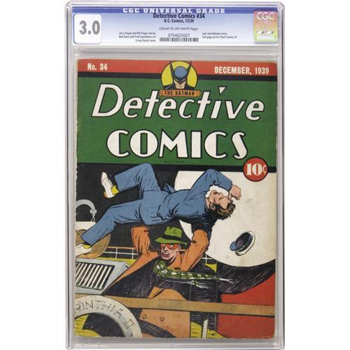 <B>Detective Comics #34 (DC, 1939) CGC GD/VG 3.0 Cream to off-white pages.</B></I> This was the last non-Batman cover of this series -- more than 780 issues have passed since then, and we don't expect another one anytime soon! It's a matter of some debate whether this is the Crimson Avenger or some other masked man, but there's no question about the cover artist thanks to the signature "Creig Flessel." Overstreet 2006 GD 2.0 value = $485; VG 4.0 value = $970. CGC census 10/06: 2 in 3.0, 9 higher.<BR><BR><b>Shipping:</b> Slabbed Comic (<a target="_blank" href="http://www.heritageauctions.com/common/shipping.php">view shipping information</a>)